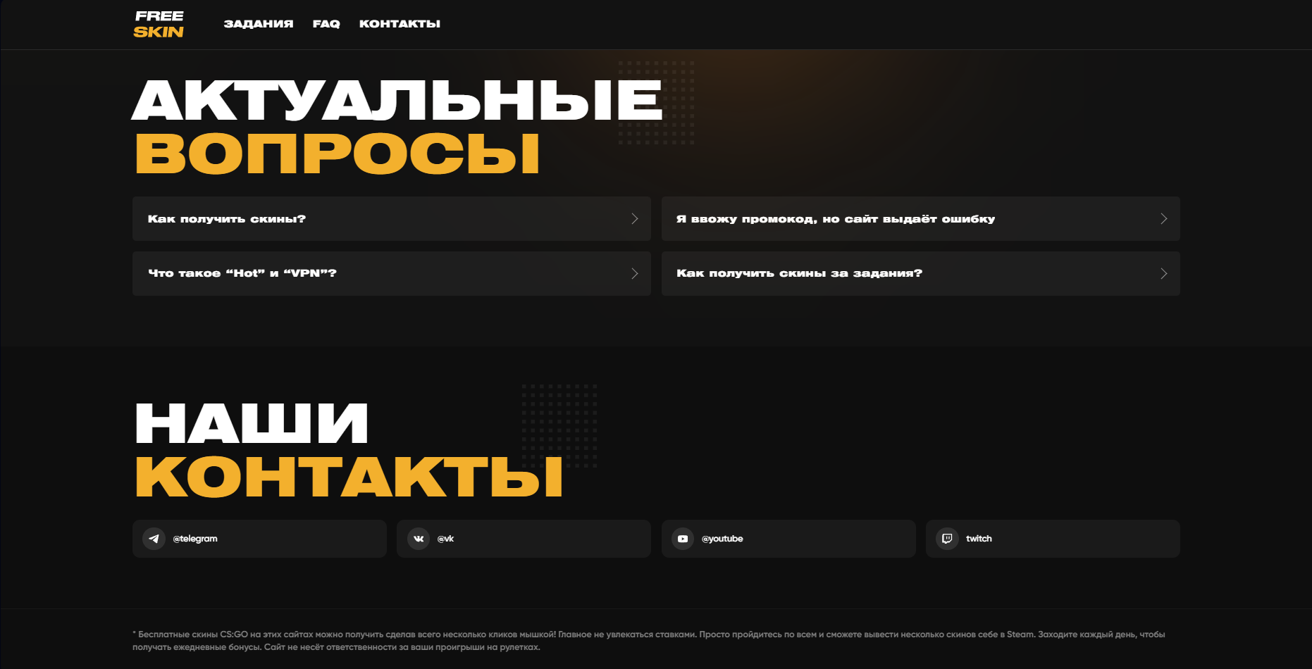 FreeSkin - отличный скрипт сайта с реферальными ссылками, есть админка для добавления карточек с бонусами. Легок в настройке и использовании. С обновлением мы представляем Вам новый, отличный дизайн, разработанный нашими дизайнерами. Скрипт переписан полностью с нуля, обновили версии php и mysql. Фронт - tailwind